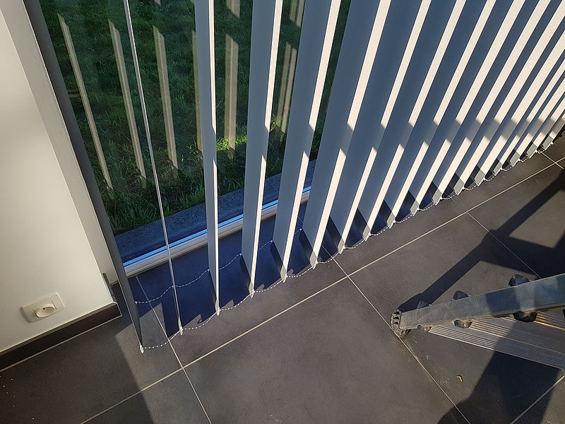 Les stores à lamelles verticales régulent en douceur l'apport de lumière, associant aspect décoratif et protection solaire.
